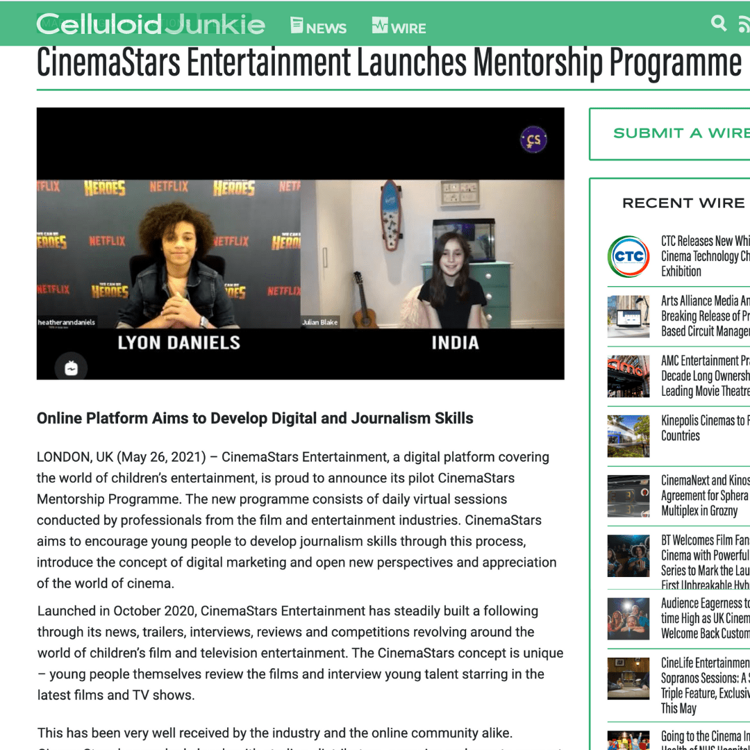 We are very excited and proud to announce the launch of the first CinemaStars Mentorship Programme! Delighted to have such great mentors on board including: Stefan Pape, HeyUGuys, Flora Neville, The Week Junior, Lexie Carducci, Riverside Radio & Abi from AKP Management! Read the full article on the Celluloid Junkie website. Click here!